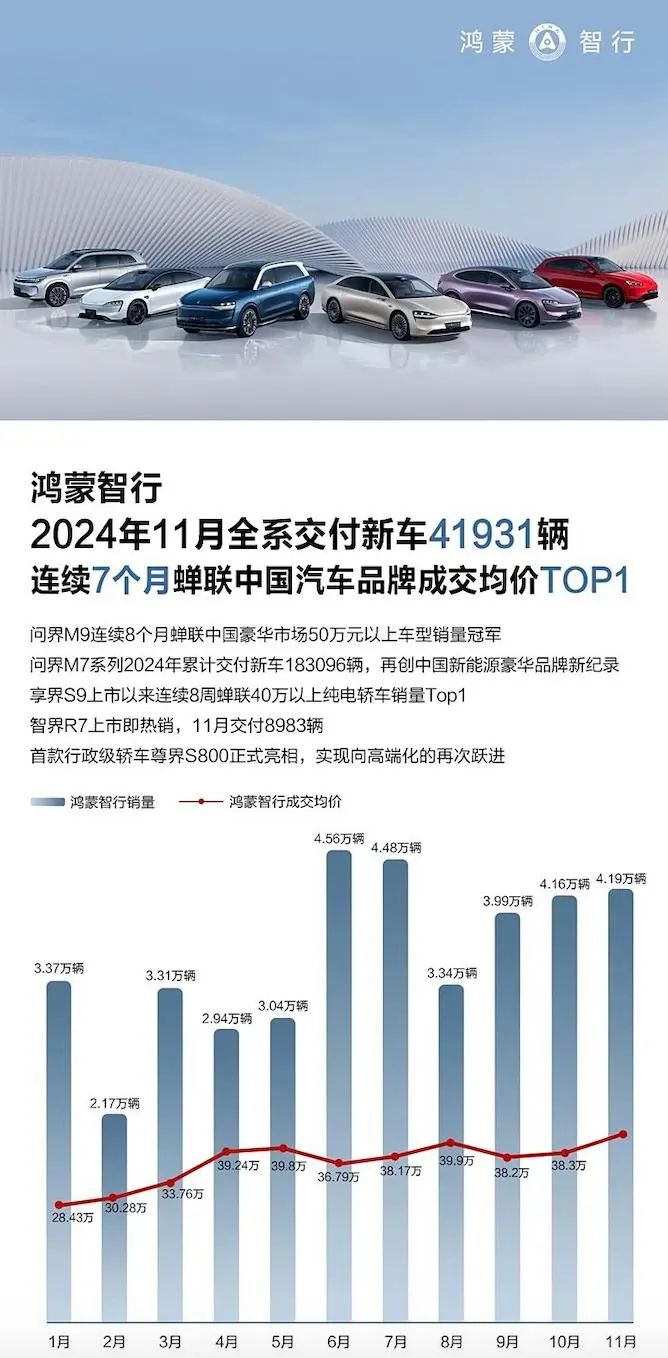11月鸿蒙智行全系交付新车41931辆,连续两个月突破4万辆,其中问界M9发布11个月累计大定突破18万辆,连续蝉联中国市场50万以上月度销冠。问界M7系列11月交付12573辆,2024年累计交付新车183096辆,智界R7 11月交付8983辆。