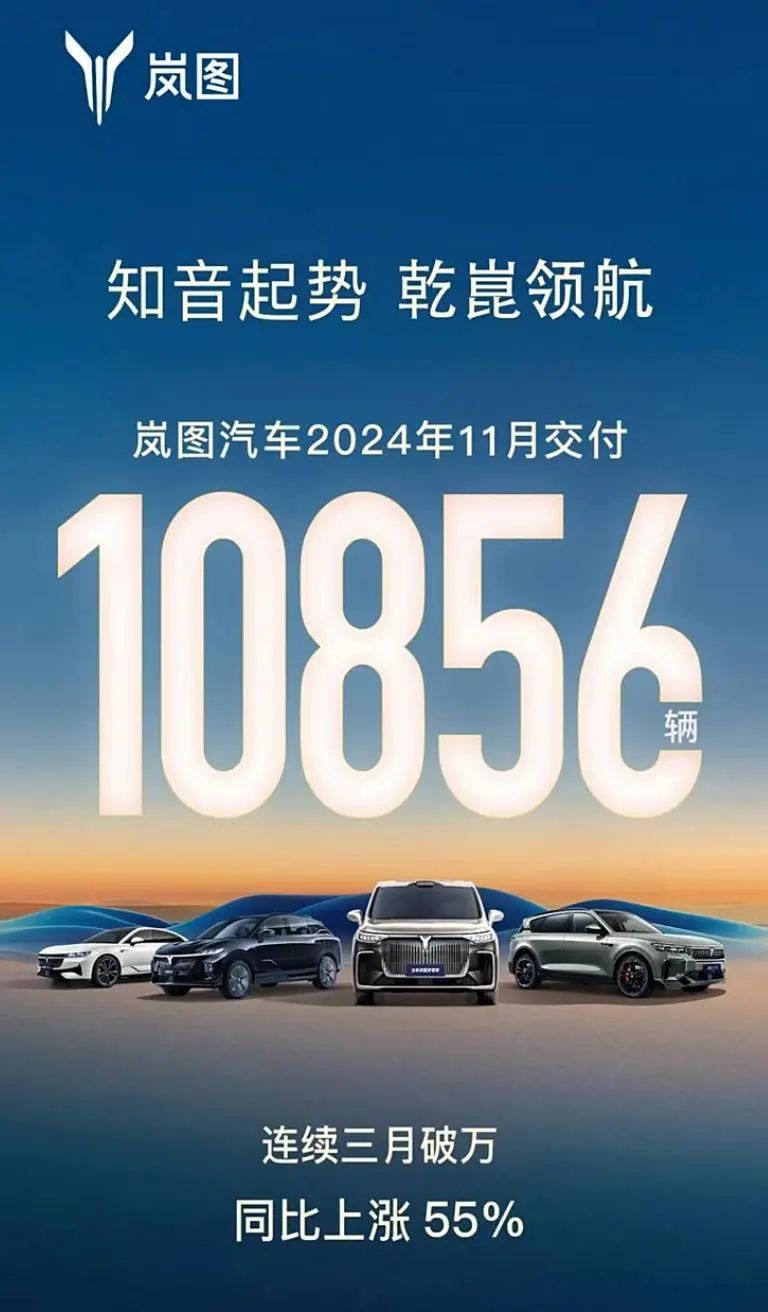 岚图汽车11月交付10856台,连续三个月交付破万,同比上涨55%。