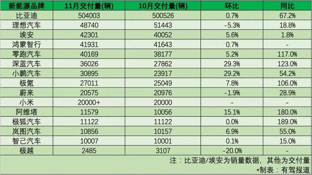 近日,各大新势力厂商公布了自己11月销量成绩,整体市场格局保持稳定,同比来看上涨趋势不减。