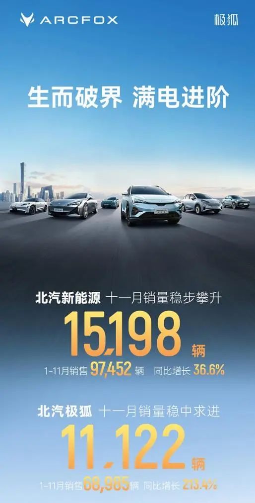 北汽新能源公布11月销量数据,北汽极狐11月销售新车11122台,1-11月累计销量68985台,同比增长213.4%。