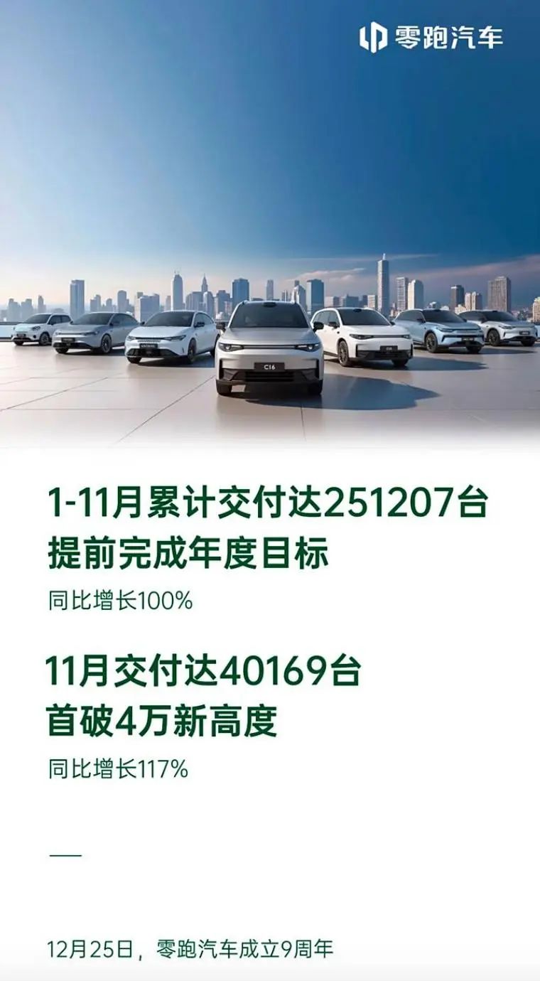 11月零跑交付达到40169台,同比增长117%。1-11月累计交付达到251207台,提前完成年度目标。官方表示,2025年,零跑汽车将向50万年度销量目标发起挑战。