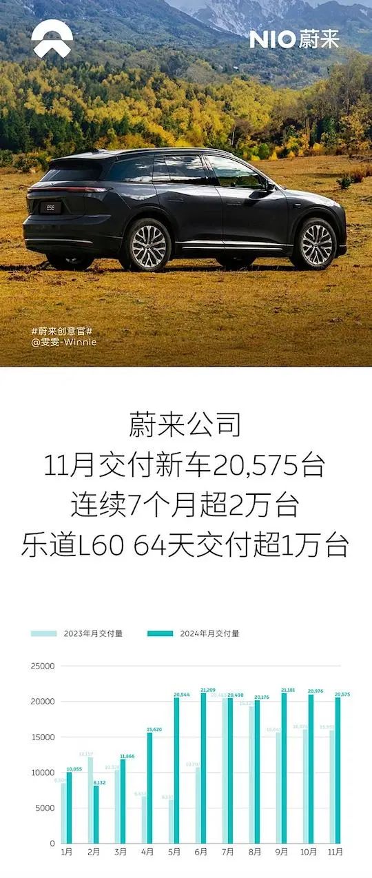 蔚来公司公布11月交付新车数据,共计交付新车20575台,连续7个月超2万台。2024年1-11月,蔚来公司共交付新车190832台,同比增长34.36%。