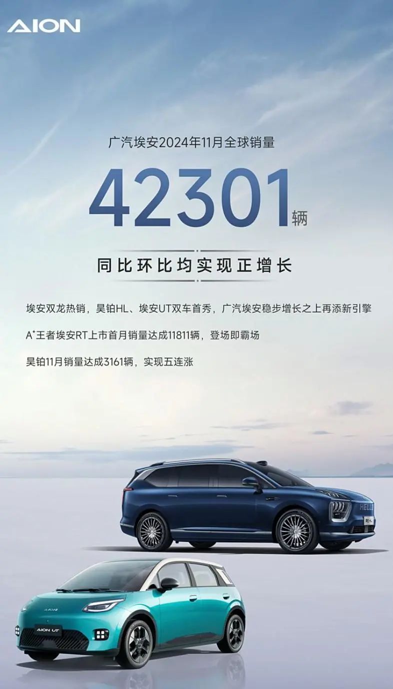 11月份,广汽埃安全球销量达42301辆,同比、环比均实现正向增长,埃安AION RT上市首月销量11811台。昊铂11月销量3161辆。