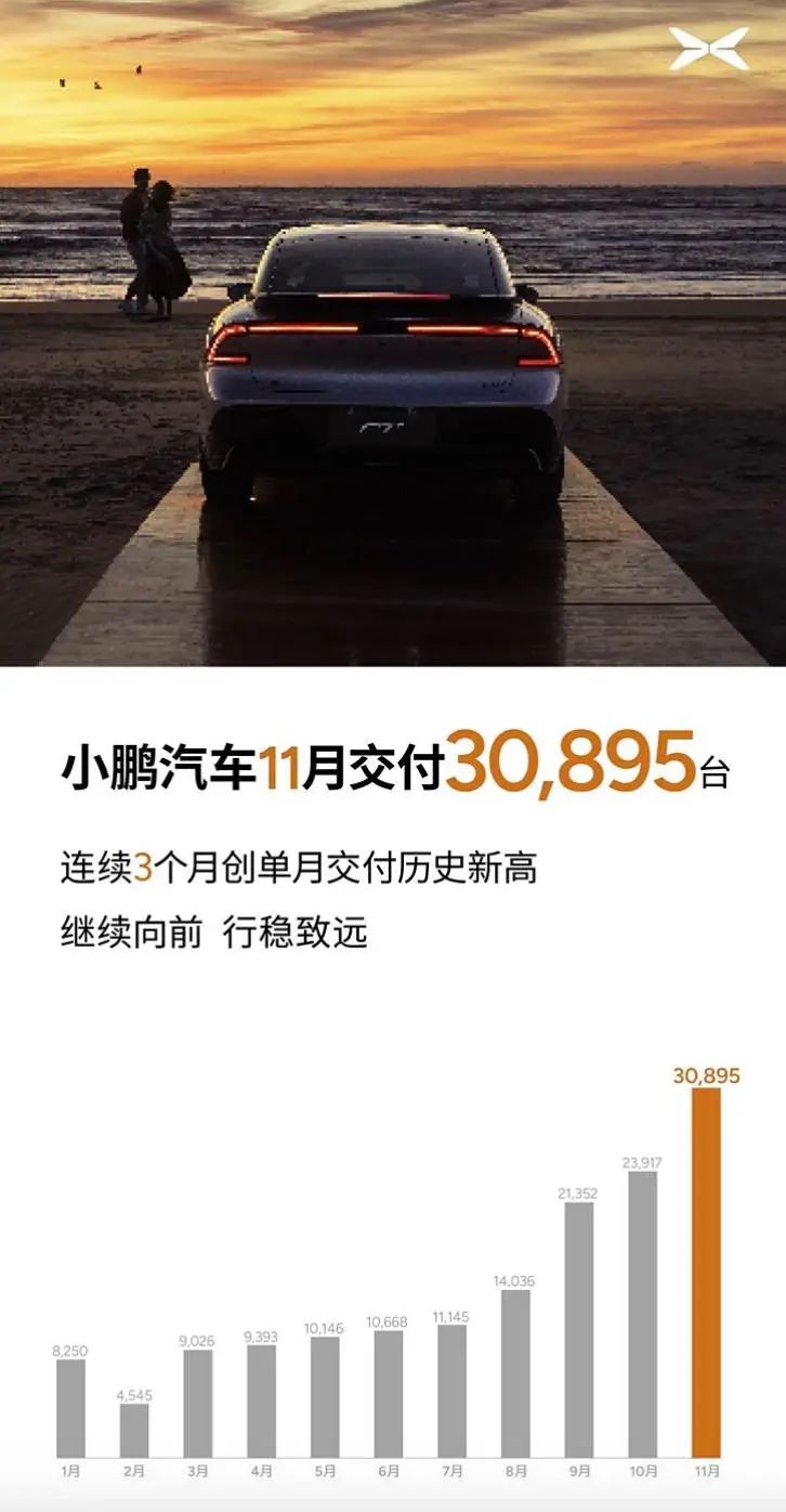 小鹏汽车公布最新交付成绩,单月交付新车30895台,同比增长54%,环比增长29%。其中,小鹏MONA M03上市3个月交付连续过万台;小鹏P7+发布23天,交付量超7000台。