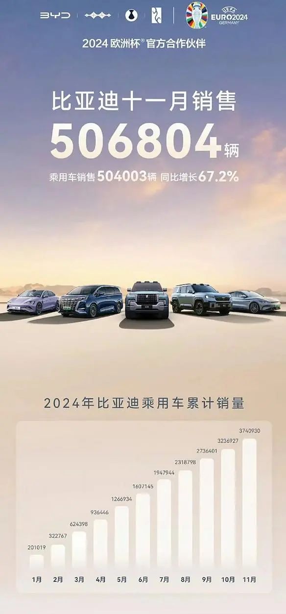 比亚迪发布11月销量数据,共计销量新车506804辆,乘用车为504003,同比增长67.2%。其中王朝和海洋共计销售新车485178辆,同比增长68.2%。方程豹汽车销量8521辆,腾势汽车销量10002辆,仰望汽车销量302辆,乘用车海外销售30977辆。