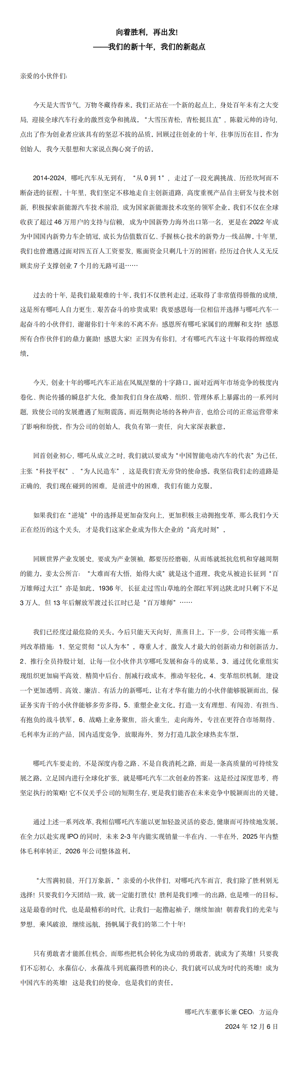 同时,方运舟发布公司全员信表示,哪吒汽车将实施六大改革举措,立足国内进行全球化扩张。通过一系列改革,哪吒汽车将在全力以赴实现IPO的同时,未来2-3年内能实现销量一半在国内、一半在国外,2025年整体毛利率转正,2026年公司整体盈利。