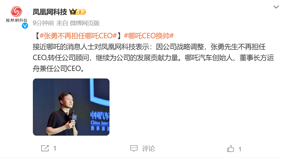 据财联社从哪吒汽车官方获悉,因公司战略调整,张勇不再担任CEO,转任公司顾问。哪吒汽车创始人、董事长方运舟兼任公司CEO。
