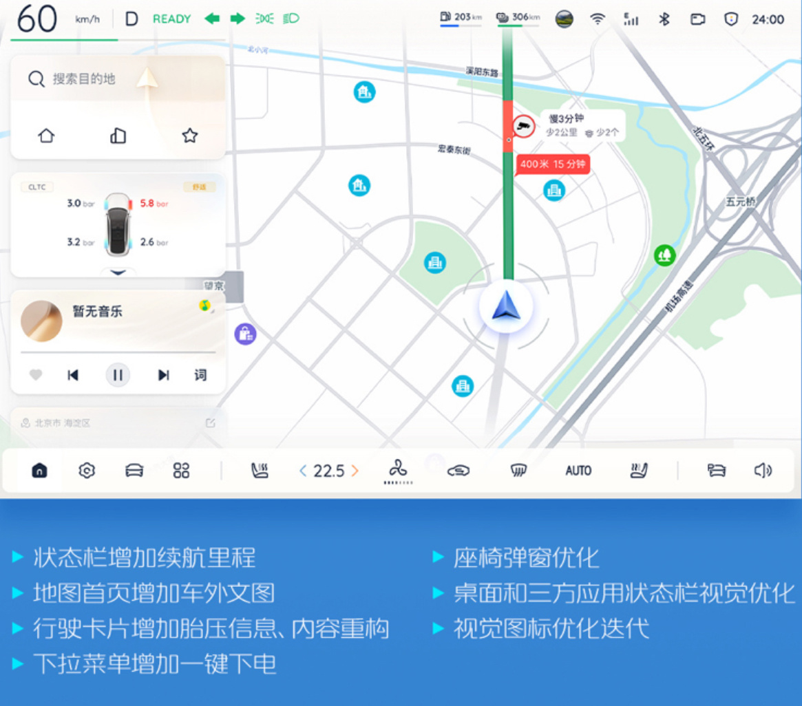 交互方面,长安启源 A07 真香版车机中控屏交互界面体验升级,优化空间布局,常用功能一键直达,例如状态栏增加续航里程、座椅弹窗优化、地图首页增加车外文图、桌面和第三方应用状态栏视觉优化、视觉图标优化迭代、行驶卡片增加胎压信息、下拉菜单增加一键下电等。