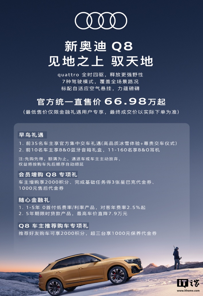 官方海报显示,切换直售模式后前 35 名购买 2024 款奥迪 Q8 的车主将享受官方集中交车礼遇(冰雪体验 + 交车仪式)、前 10 名车主享 B&O 蓝牙音箱礼盒、11-160 名享 B&O 耳机,以及奥迪车主增购享 2000 积分等权益。此外,车主还可选择 1-5 年 0 首付低费率 / 利率产品,对客费率 2.5% 起;选择 5 年期限时贷款产品,最高车价直降 7.9 万元。