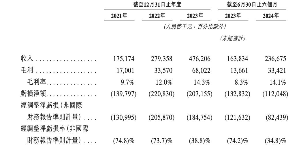 招股书显示,报告期内,佑驾创新的收入分别约为1.75亿、2.79亿、4.76亿、2.37亿元,三年半累计收入约11.67亿元;毛利分别约为1700.1万、3357.0万、6802.2万、3342.1万元,毛利率分别为9.7%、12.0%、14.3%、14.1%;年内/期内亏损分别约为1.40亿、2.21亿、2.07亿、1.12亿元,三年半累计亏损约6.80亿元;经调整净亏损(非国际财务报告准则计量)分别约为1.31亿、2.06亿、1.85亿、8243.9万元,经调整净亏损率分别为74.8%、73.7%、38.8%、34.8%。