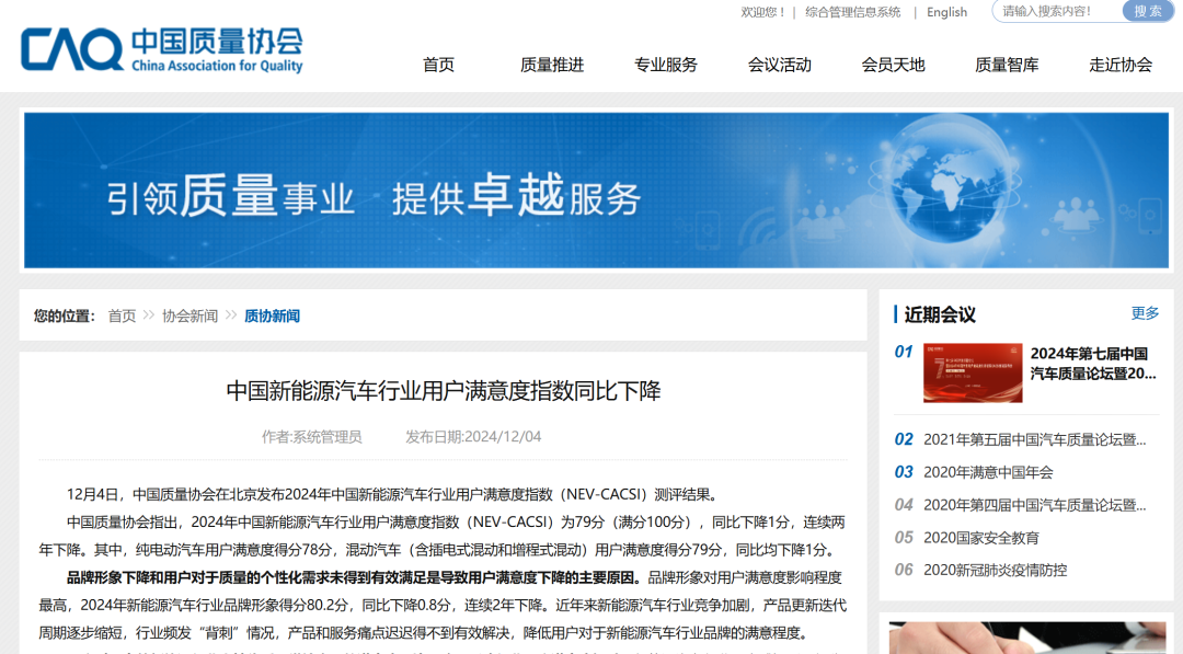 前两天中国质量协会发了篇文章,说今年中国新能源汽车行业用户满意度指数为79分(满分100分)同比下降1分,并且还是连续两年下降。