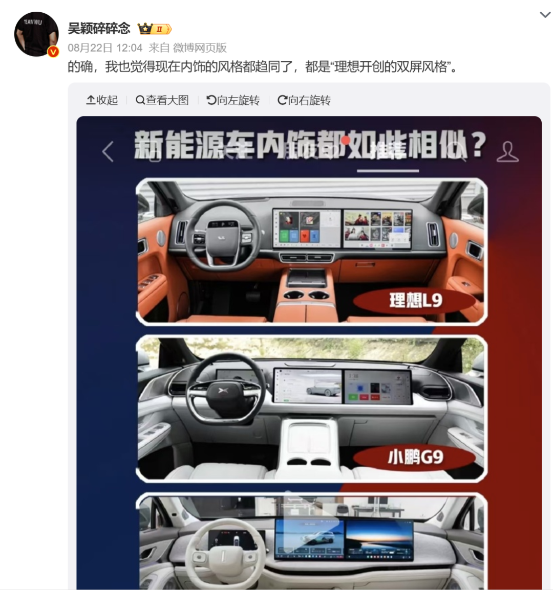 内饰设计趋同性则是另一个槽点,有博主放上了几家车企的前排图片,不仔细看几乎分不清谁是谁。