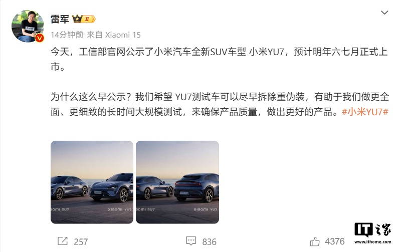 雷军称:“我们希望 YU7 测试车可以尽早拆除重伪装,有助于我们做更全面、更细致的长时间大规模测试,来确保产品质量,做出更好的产品。”