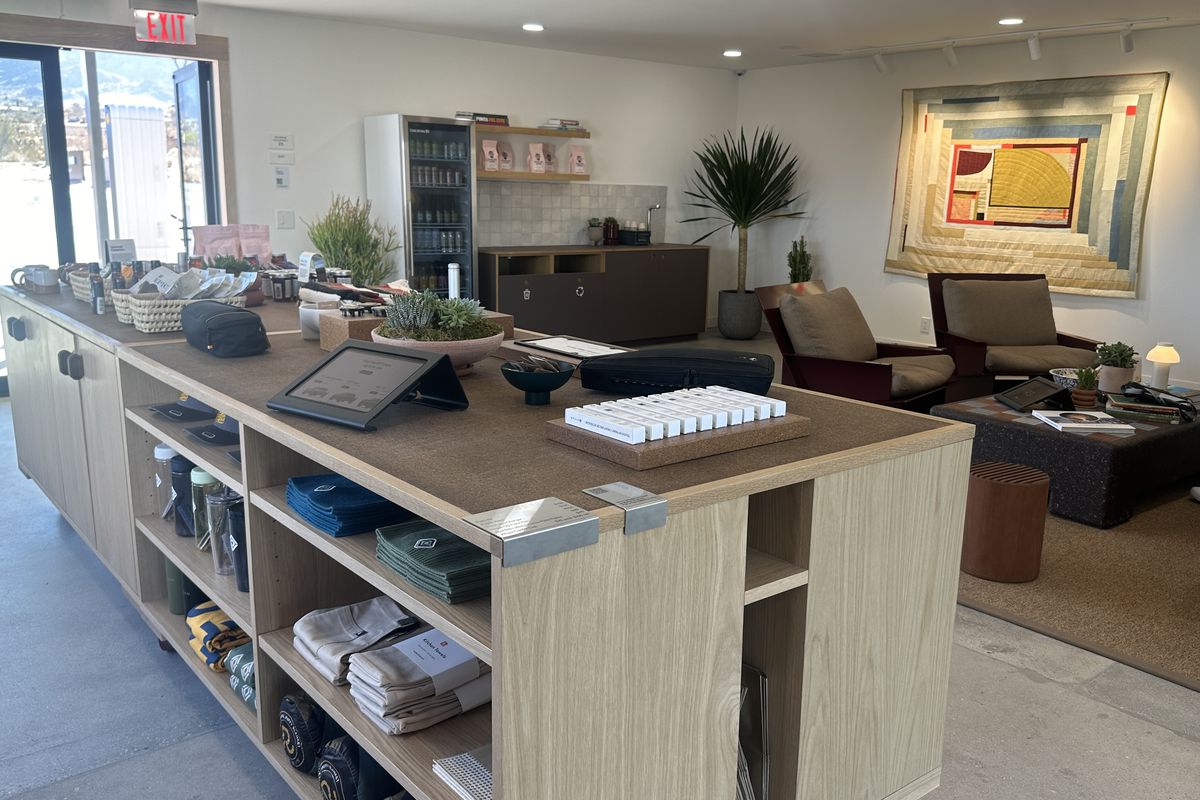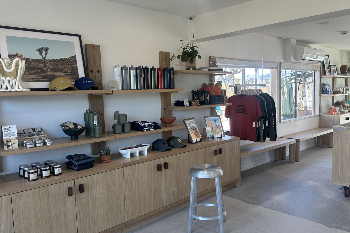 这就是电动汽车充电站应有的样子。一进门,就是一个温馨的交谈区,里面摆放着积木和精美的咖啡桌书籍供人翻阅。这里出售当地产品,并提供约书亚树咖啡公司提供的免费咖啡(虽然我不喝咖啡,但据说味道不错)。你还可以购买零食和饮料,但别指望找到传统的加油站食品。这里提供的是烤大蒜西班牙白凤尾鱼、柠檬水鲭鱼、有机饼干和青酱等高档熟食板所需的一切食材,甚至连汽水都是有机产品。