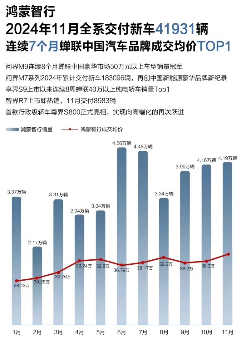 根据官方信息,鸿蒙智行已经连续7个月蝉联中国汽车品牌成交均价TOP1。