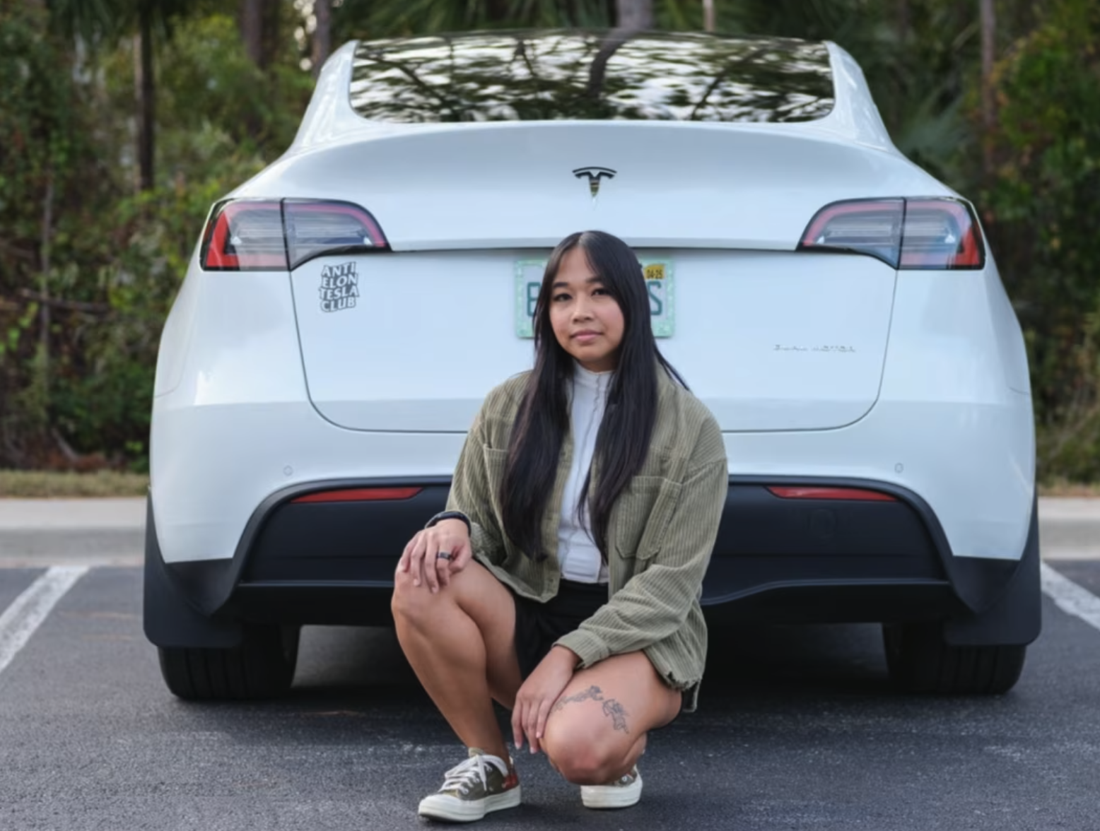 她为自己的车买了一个“反埃隆特斯拉俱乐部”的车贴,还给她母亲也买了一个。