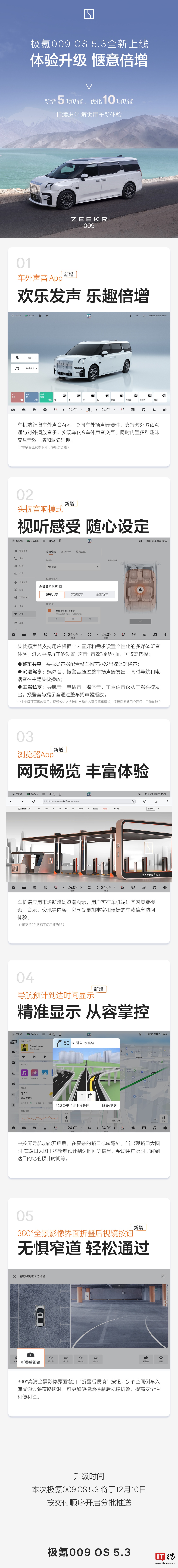 IT之家 12 月 10 日消息,极氪汽车今日宣布,极氪 009 获推 OS 5.3 更新,将于今日(12 月 10 日)按交付顺序开启分批推送。