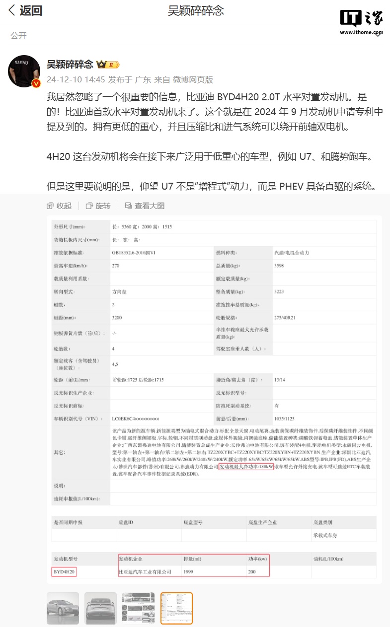 据博主 @吴颖碎碎念 今日消息,这款 BYD4H20 2.0T 发动机,是比亚迪首款水平对置发动机,拥有更低的重心,并且压缩比和进气系统可以绕开前轴双电机。此外,BYD4H20 这台发动机将会在接下来广泛用于低重心的车型,例如 U7、和腾势跑车。