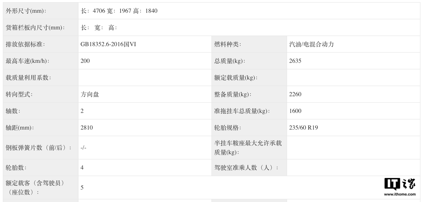 IT之家获悉,本次申报的车型标配 19 英寸轮毂,整备质量 2260 公斤,作为参考,现款山海 T1 整备质量 2000 公斤。整车长宽高分别为 4706x1967x1840 毫米,轴距为 2810 毫米。