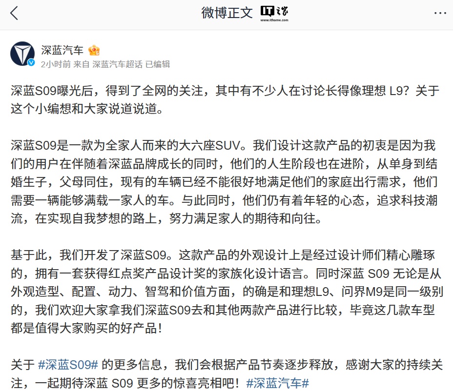 IT之家 12 月 10 日消息,深蓝 S09 SUV 官图今日正式发布,深蓝汽车官方针对新车“不少人在讨论长得像理想 L9”这一情况进行说明。IT之家附官方原文内容如下: