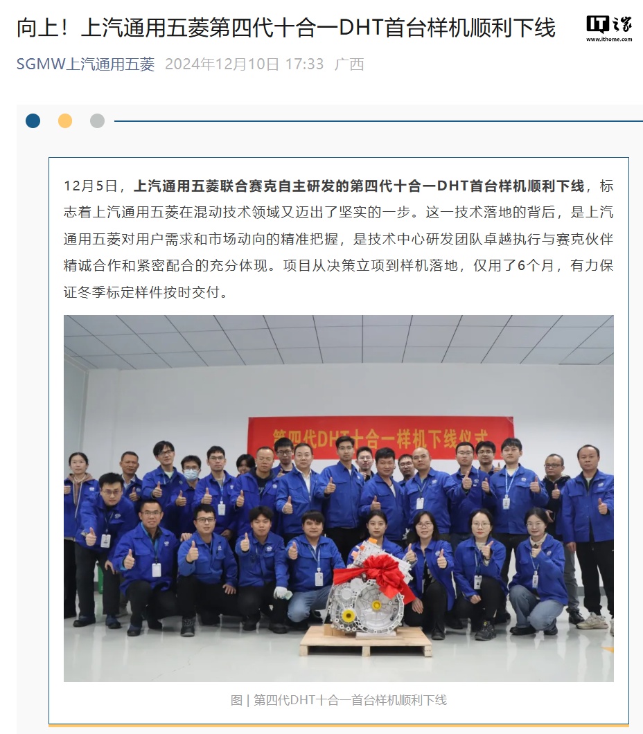 IT之家 12 月 10 日消息,上汽通用五菱今日宣布,该公司联合赛克自主研发的第四代十合一 DHT(IT之家注:混合动力专用变速箱)首台样机于 12 月 5 日顺利下线。项目从决策立项到样机落地用了 6 个月,保证冬季标定样件按时交付。
