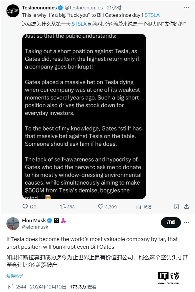 IT之家 12 月 11 日消息,埃隆・马斯克(Elon Musk)今天在 X 平台发文称,如果特斯拉的股价继续上涨到一定水平,全球的空头都将被消灭,甚至包括曾经的全球首富比尔・盖茨(Bill Gates)。