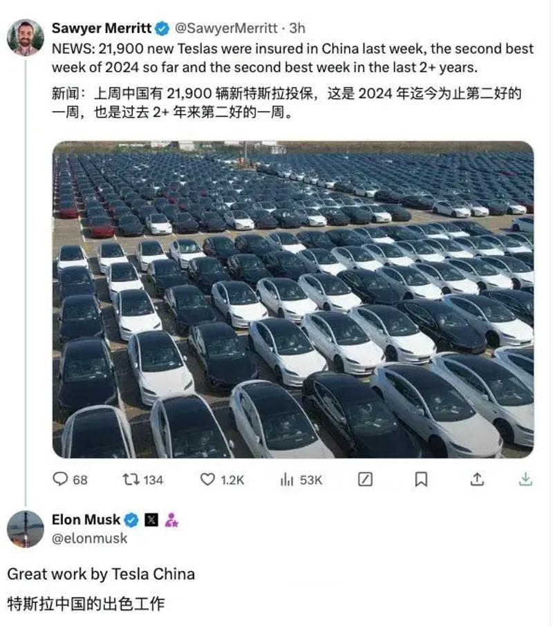 据理想汽车公布的周销量数据显示,特斯拉上周(12.2-12.8)中国市场销量达到2.19万辆,这是特斯拉2024年迄今为止第二好的一周。对于中国市场销量的优异表现得到了特斯拉CEO马斯克的高度认可,他在社交媒体上在线点赞称:“特斯拉中国的出色工作”。