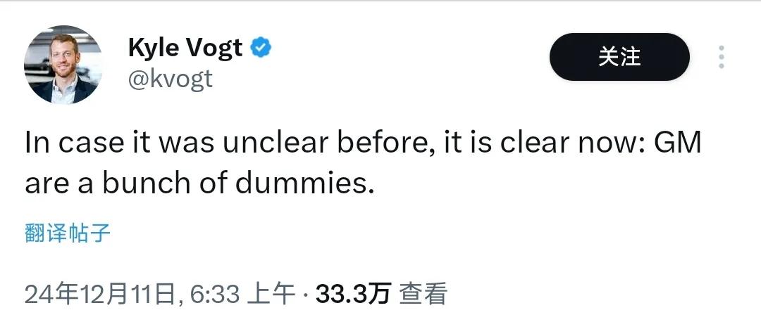 有意思的是,因为此前隐瞒事故而引咎辞职的Cruise创始人兼前任CEO凯尔·沃格特(Kyle Vogt),当天就在X平台发文吐槽:“如果之前还不清楚,现在已经很清楚了: 通用汽车就是一群笨蛋。”