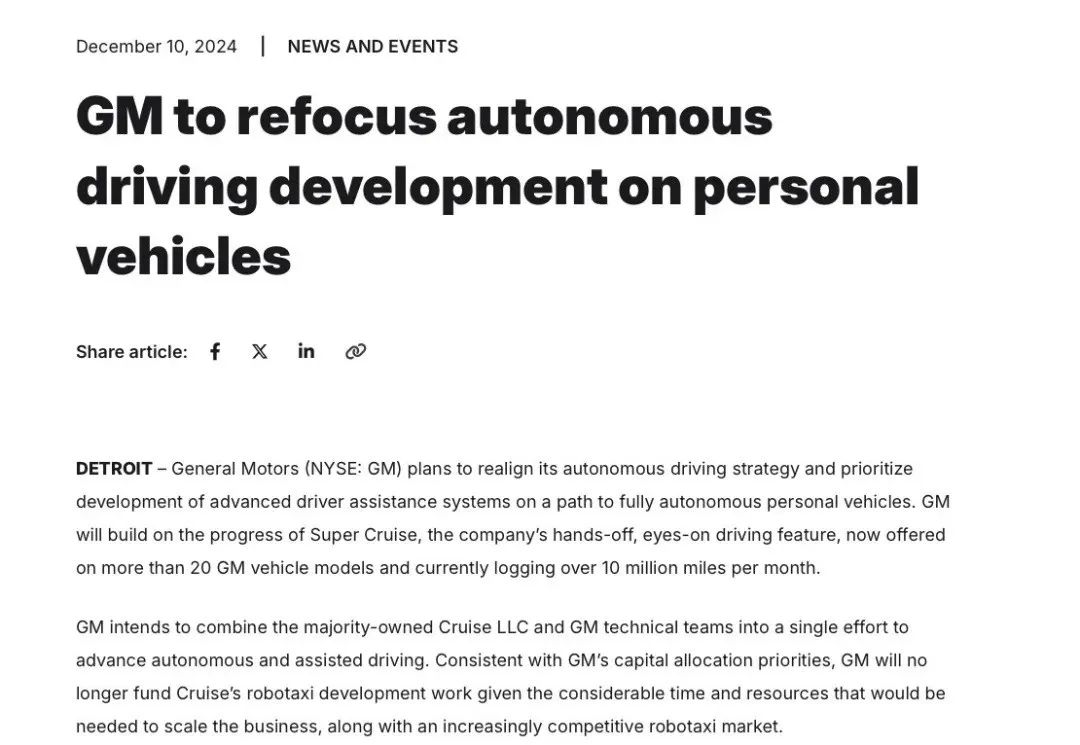 通用汽车刚刚宣布,将调整自动驾驶战略,不再资助Cruise无人出租车(Robotaxi)的开发工作。