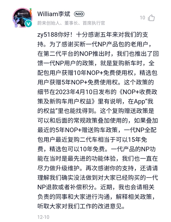 对此,蔚来董事长李斌回应称,随着第二代平台NOP的推出,蔚来也推出了回馈第一代NP用户的政策。