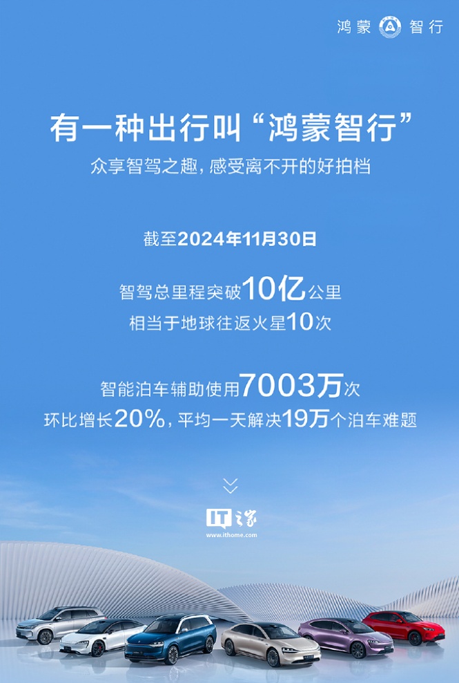 IT之家 12 月 11 日消息,鸿蒙智行官方今日公布数据:截至 2024 年 11 月 30 日,旗下全系车型(指在售车型)智驾总里程突破 10 亿公里,智能泊车辅助使用 7003 万次。