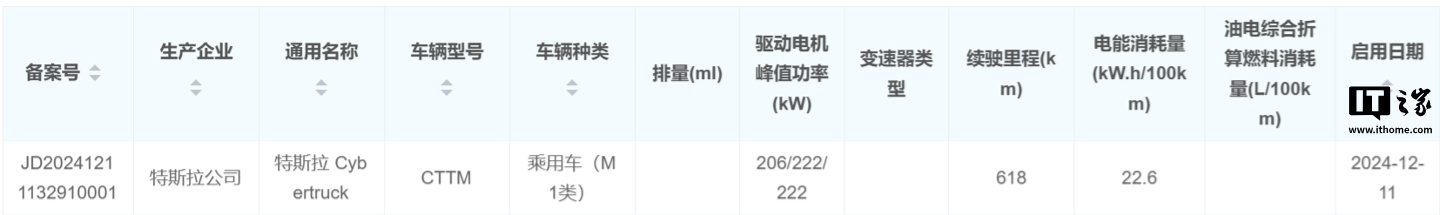 IT之家 12 月 11 日消息,特斯拉 Cybertruck 电动皮卡今日完成工信部汽车能源消耗量测算申报。数据显示,赛博越野旅行车百公里能耗 22.6 度,续航里程 618km,车辆种类为乘用车。