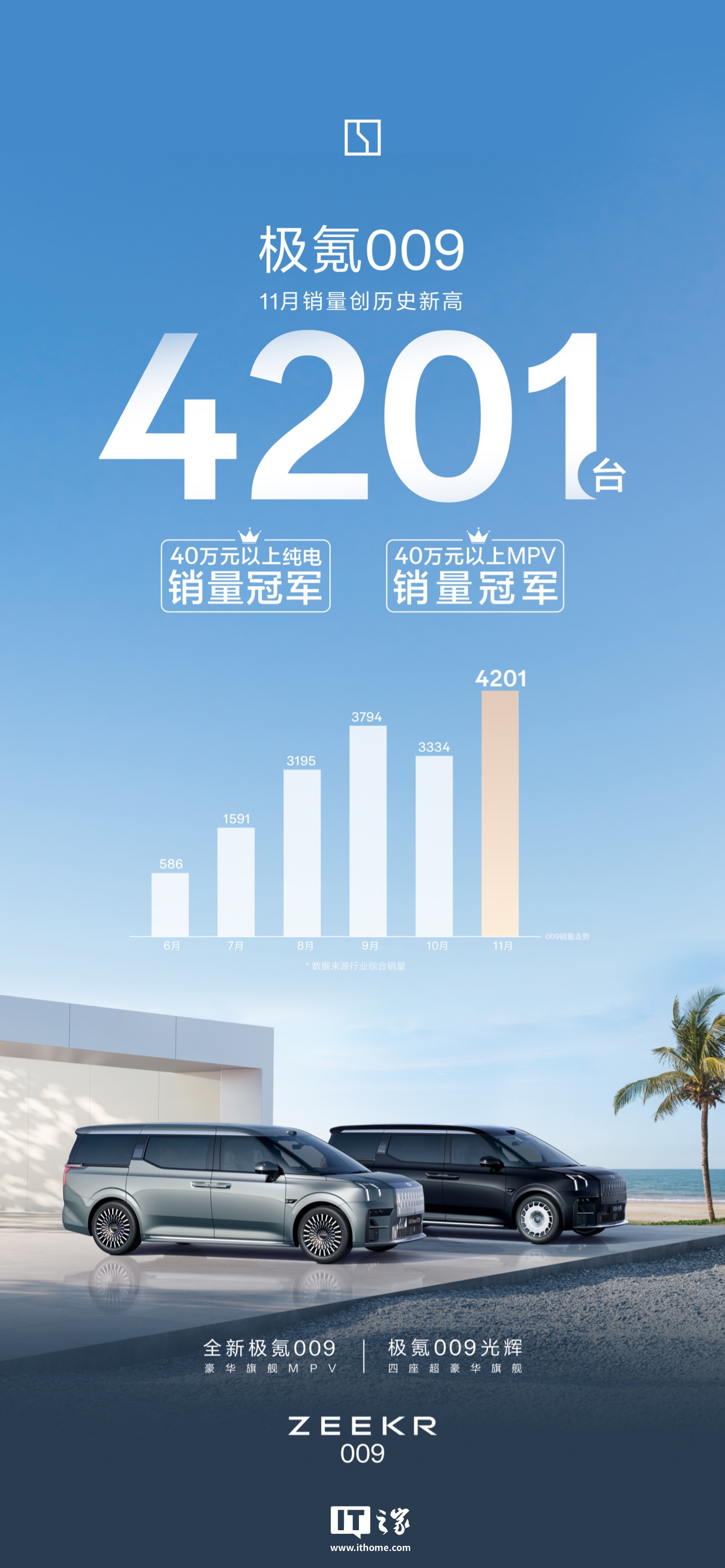 IT之家 12 月 11 日消息,极氪官方今日发文宣布,旗下 009 MPV 汽车 11 月销量 4201 台,创历史新高。同时官方宣称其“蝉联 40 万以上纯电车型、40 万以上 MPV 销量双冠军”。
