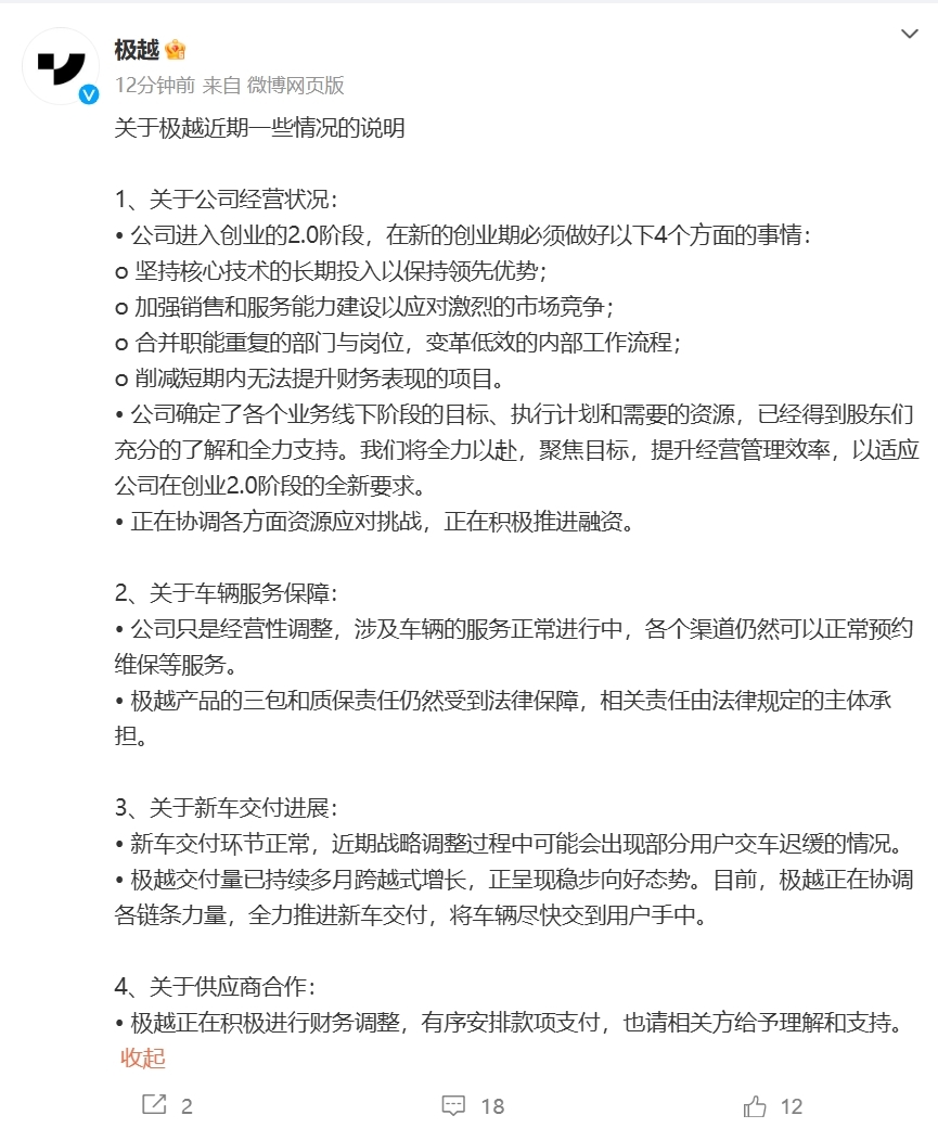 极越正在积极进行财务调整,有序安排款项支付,也请相关方给予理解和支持。
