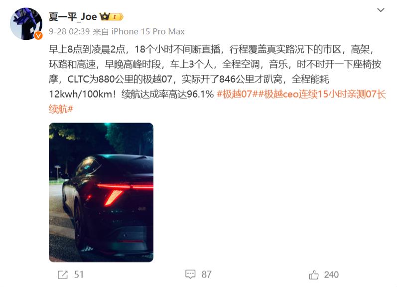 9月底,夏一平亲自上阵,进行了一场真实路况下的极越07续航直播。从出发到彻底把车辆干“趴窝”,整场直播持续了整整18个小时,打破了车企CEO持续直播的时长纪录。