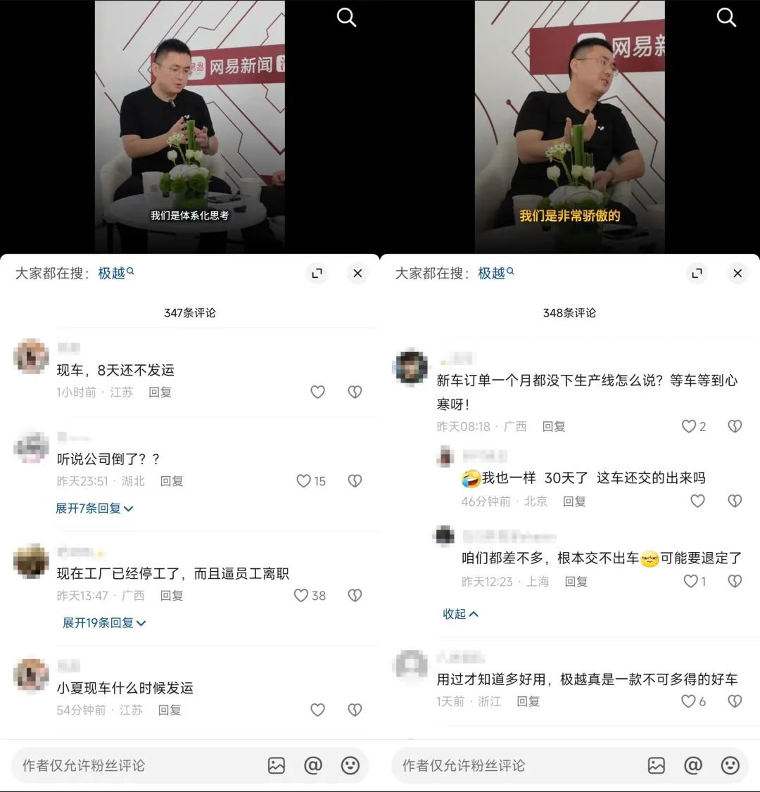 被媒体、媒介追债的情节,刚刚才在哪吒汽车上发生过,当然哪吒汽车5355万的欠债数额要大得多。无独有偶,此前源媒汇还报道过有哪吒车主出现提车难的情况,如今极越汽车CEO夏一平的社媒账号评论区里,也出现一批疑似车主,称定了现车但车企迟迟不发运。