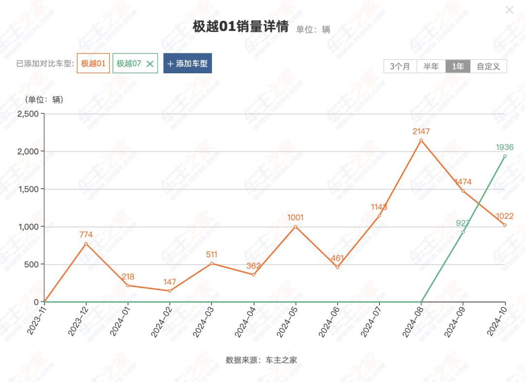 根据“车主之家”提供的数据显示,极越01在2023年12月全国上牌为774辆,最低点在2023年1月仅为147辆。2024年1-11月极越汽车整体销量为1.3万辆。