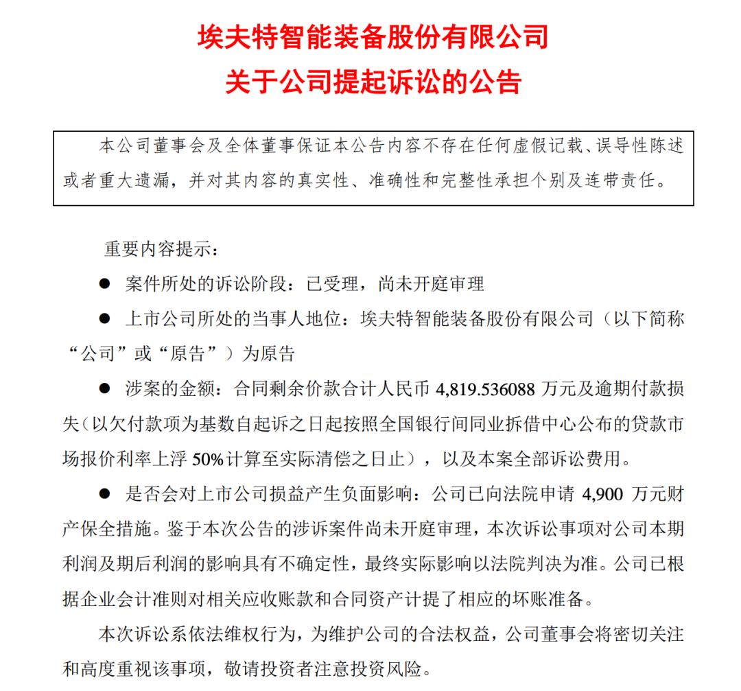 然后在 11 月 8 日,哪吒的供应商上市公司埃夫特发公告,哪吒欠它 4800 多万,已经向法院起诉。紧接着,又有两家上市公司东风科技和福石控股发了诉讼公告,哪吒分别欠这两家 1273 万和 5355 万。